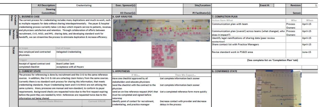 Using the Lean A3 process, Cred2Bill partnered with hospital leadership to identify inefficiencies, map the current workflow, and implement sustainable automation. Cred2Bill leverages the Lean A3 process improvement methodology to streamline credentialing workflows and eliminate inefficiencies. By partnering closely with hospital leadership, we identify pain points, map the current process, and implement sustainable solutions through credentialing automation.